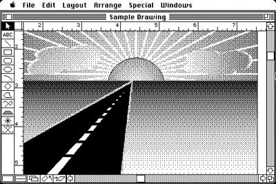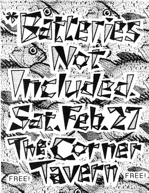 "I did that flyer myself. Some of our stuff was done in CricketDraw, but this looks like it was done in MacDraw or possibly MacPaint. The fish was an image that was included in the old Macs in a clipboard images library as an example. The letters were drawn by me in the program (they weren't a font). Makes me want to fire up the old Mac 512k and play with it (I still have it, and it works)."