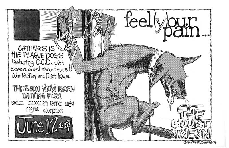 The flyer is really a Plague Dogs promo, illustrated by the incomparable John T. Quinn III; Plague Dogs' leader David Aaron Clark was himself a Catharsis enthusiast and so put them at the top of the bill, and good for him.