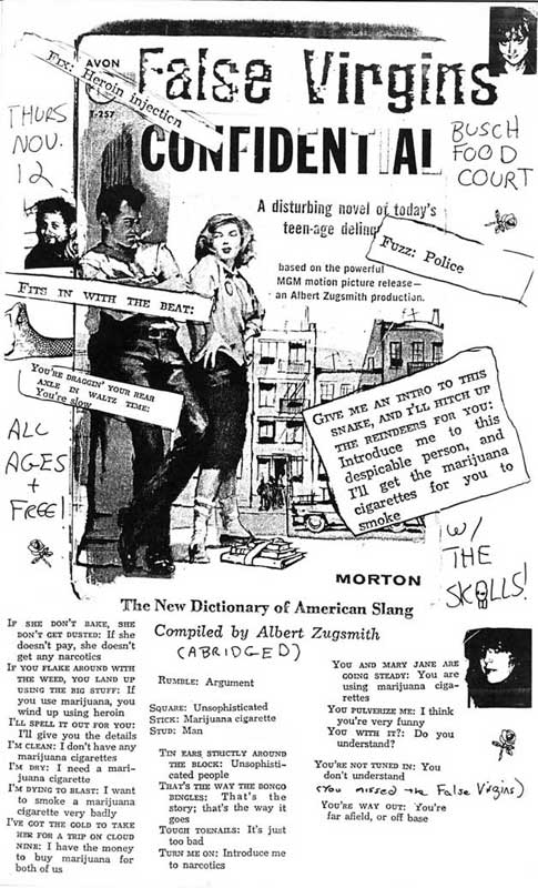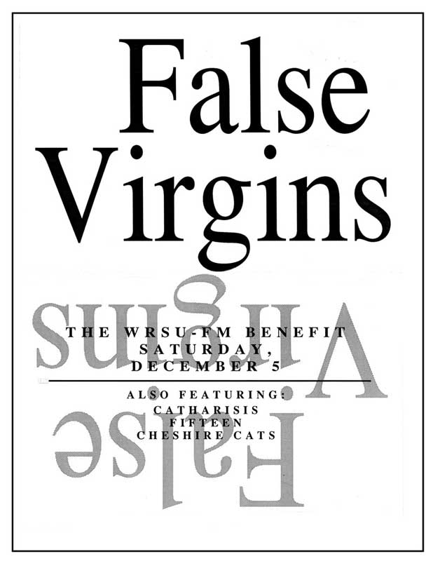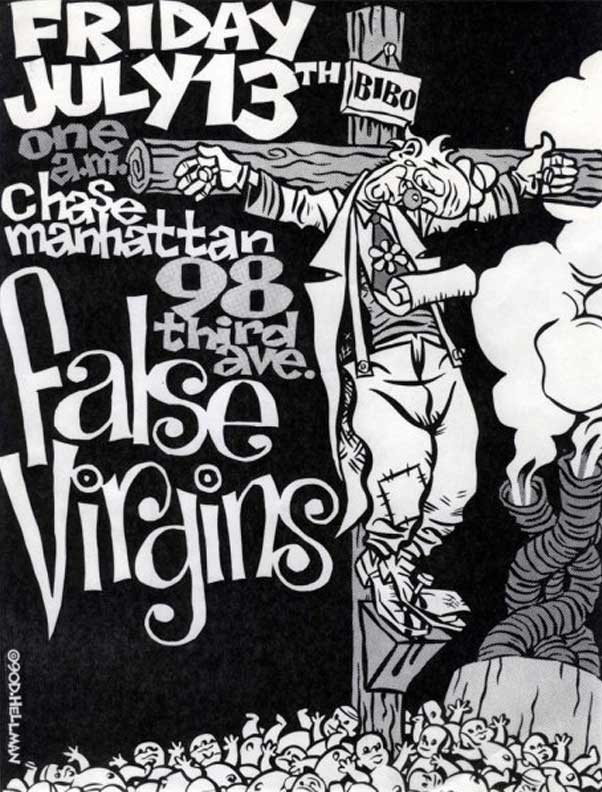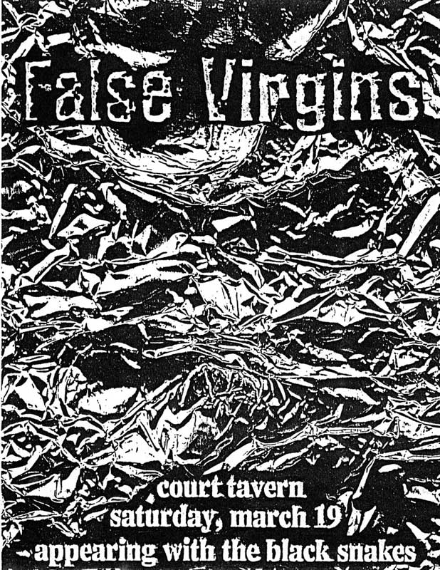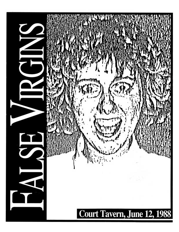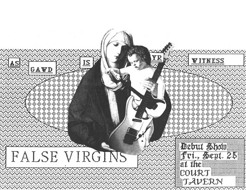 I have many False Virgins flyers because I knew the band, and was tasked with creating several of them. I have no evidence that Quinn did any, surprising given his considerable talents. See Plague Dogs for fine examples of his work. The Jessica Hahn flyer was a Lubben inspiration (she calls it "a no-brainer"). It's also rips off Sonic Youth's Into The Groove(y) sleeve, but whatever.
