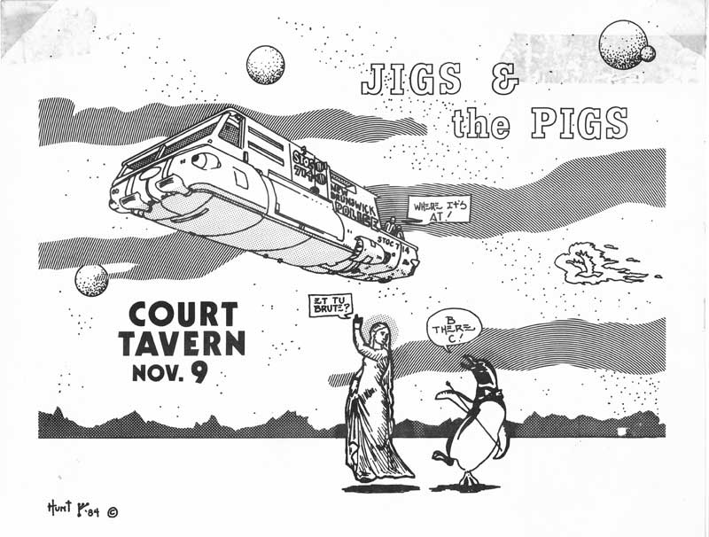 This is a terrific flyer from 1984 by Peter Hunt, for whom I have no information whatsoever, though he evidently did a lot of nice work around town. Not sure exactly how far into the future this illustration is supposed to depict, but last I checked, the New Brunswick police force was still driving cars, on the ground.
