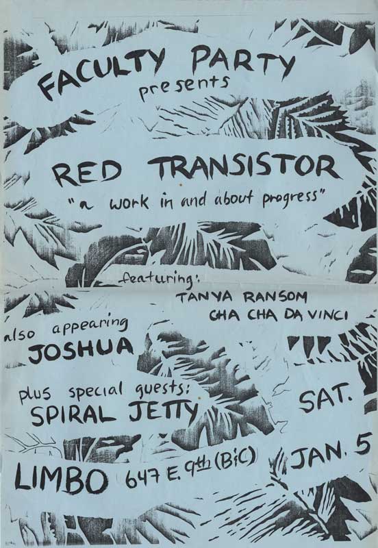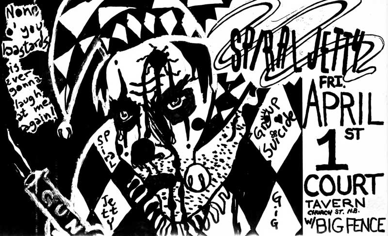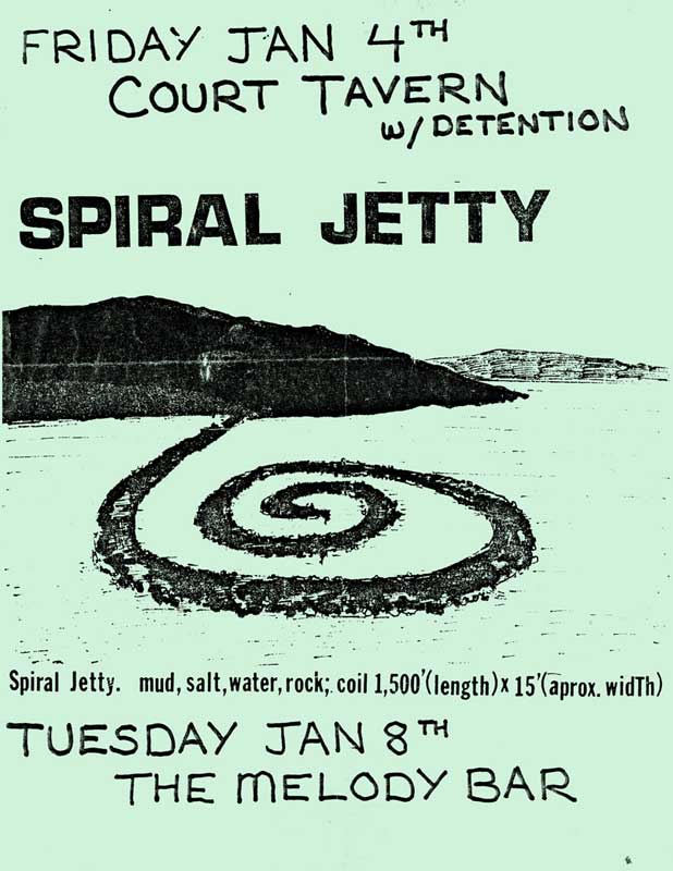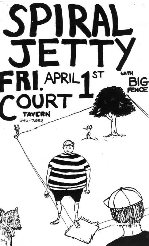 Spiral Jetty promotions were generally primitive and strange affairs. Worth noting is the one featuring the Spiral Jetty itself, listing its building materials ("mud, salt, water, rock" — this phrase was chanted by band and audience during a wild performance by the Great Salt Lakes Orchestra, which included SJ and slew of others). Then there's the angry clown on the "Group Suicide" flyer, very nice; it's clearly an homage to SST's house artist Raymond Pettibon, as is the one for the Maxwell's gig. No idea of what to make of the baseball flyer; it's just disturbing.